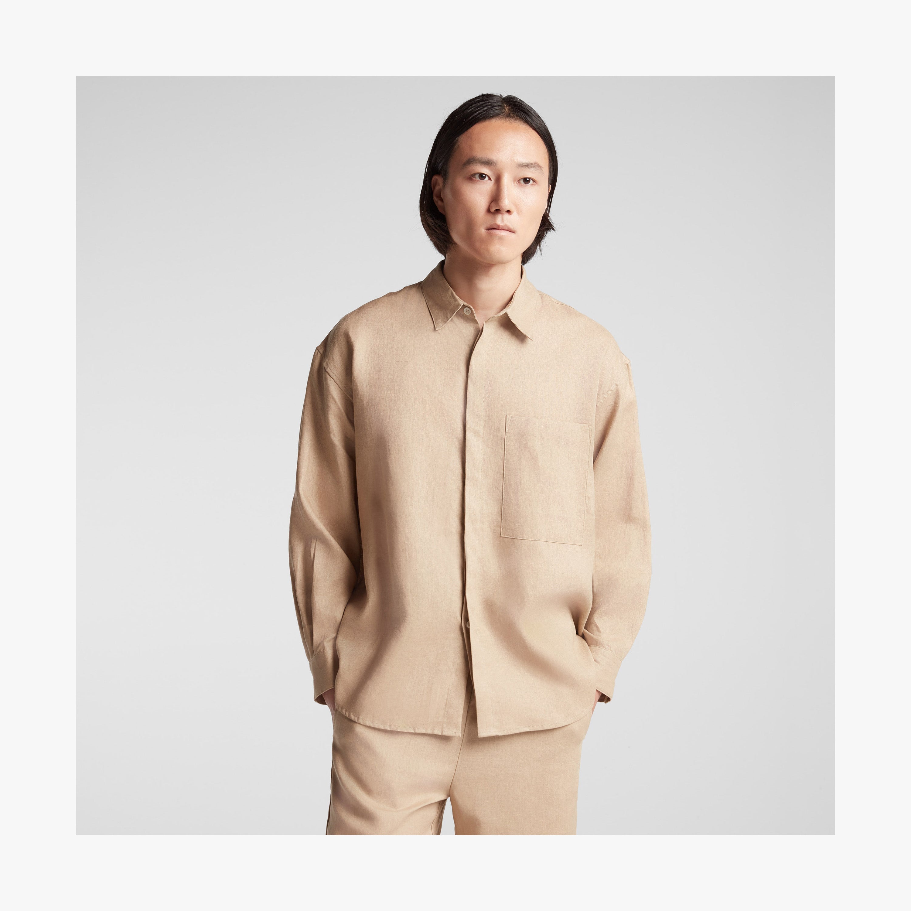 Features a classic point collar, dropped shoulders, and a minimal patched pocket